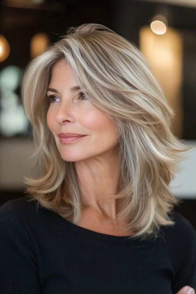 Silver-blonde tones paired with layered volume make this look both modern and timeless. The airy texture keeps it soft, while the cool hue adds a sophisticated shine.